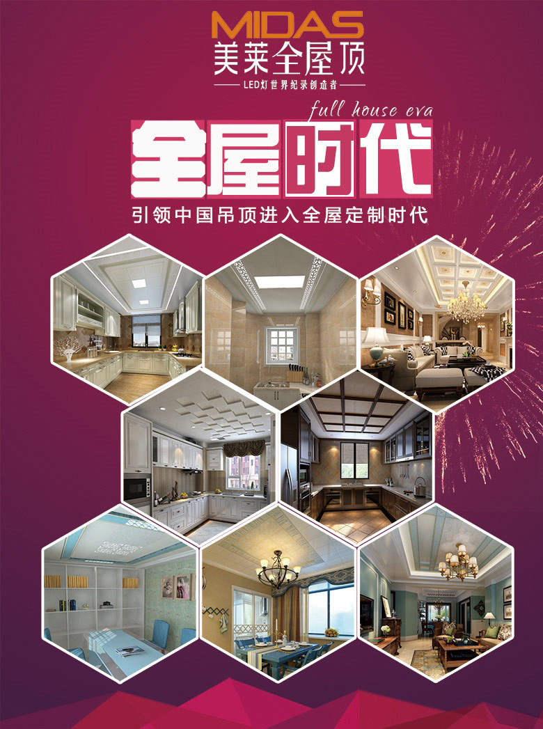 多年来,MIDAS美莱以其创新的技术、出众的产品和令人信赖的品质确立了行业领先地位,产品涵盖集成化顶、取暖系统、照明系统、通风系统、个性音响系统、智能晾衣架阳台顶配套系统。中式、现代简约、地中海、美式、欧式五大全系风格的数百种产品完全可根据消费者的设计要求量身定制扣板的色彩、造型、尺寸以及功能电器的搭配。为成千上万的用户提供厨房、卫浴间、卧房、青少年房、书房、餐厅、过道、 阳台、书房等“8+1”九大家居空间的吊顶定制解决方案。MIDAS美莱通过对艺术工艺的深入挖掘,精益求精的细节处理,和谐的全屋风格搭配,带给居者有的不只是豪华大气,还有延绵不绝的舒适享受。